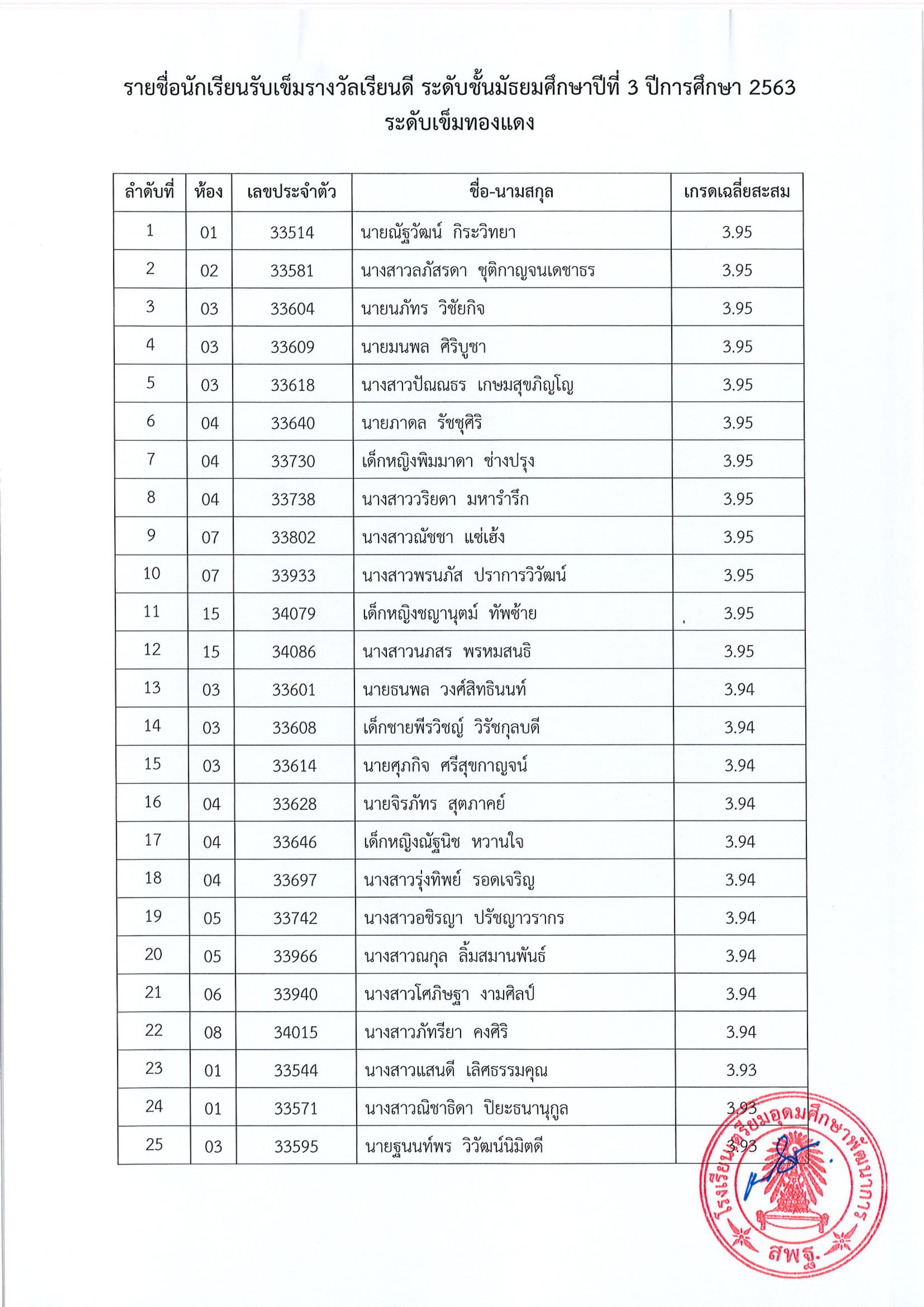 รายชื่อนักเรียนได้รับรางวัลเข็มเรียนดี ระดับชั้นมัธยมศึกษาตอนต้น